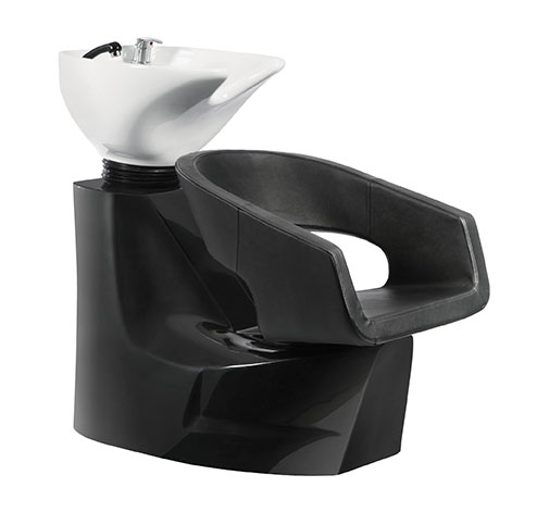 Das tiefe, kippbare Waschbecken aus schwarzer Keramik bietet ein komfortables Wascherlebnis. Der Sitz kann in zwei Positionen fixiert werden und ist mit hochwertigem schwarzem Stoff bezogen, was zusätzlichen Komfort bietet. Das gebogene Design auf der Rückseite des Beckens verbessert die Haltung des Profis während der Arbeit.
