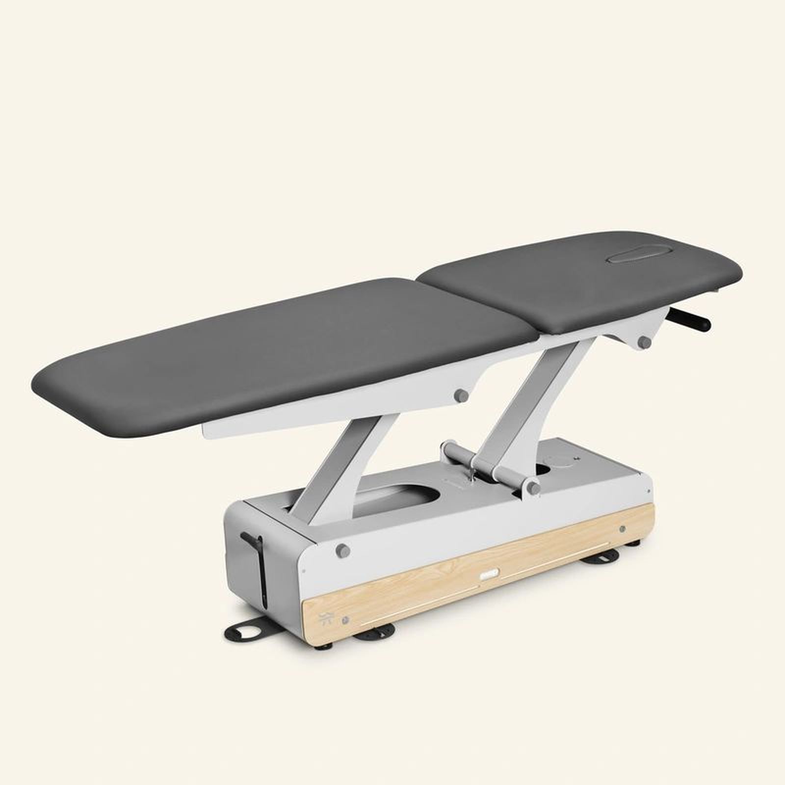 Das lange Kopfteil bietet maximale Flexibilität und Komfort für verschiedene Behandlungspositionen. Zwei Gasfedern sorgen für außergewöhnliche Stabilität, während der ergonomische Handgriff und der integrierte Rollenhalter die Nutzung besonders angenehm machen.